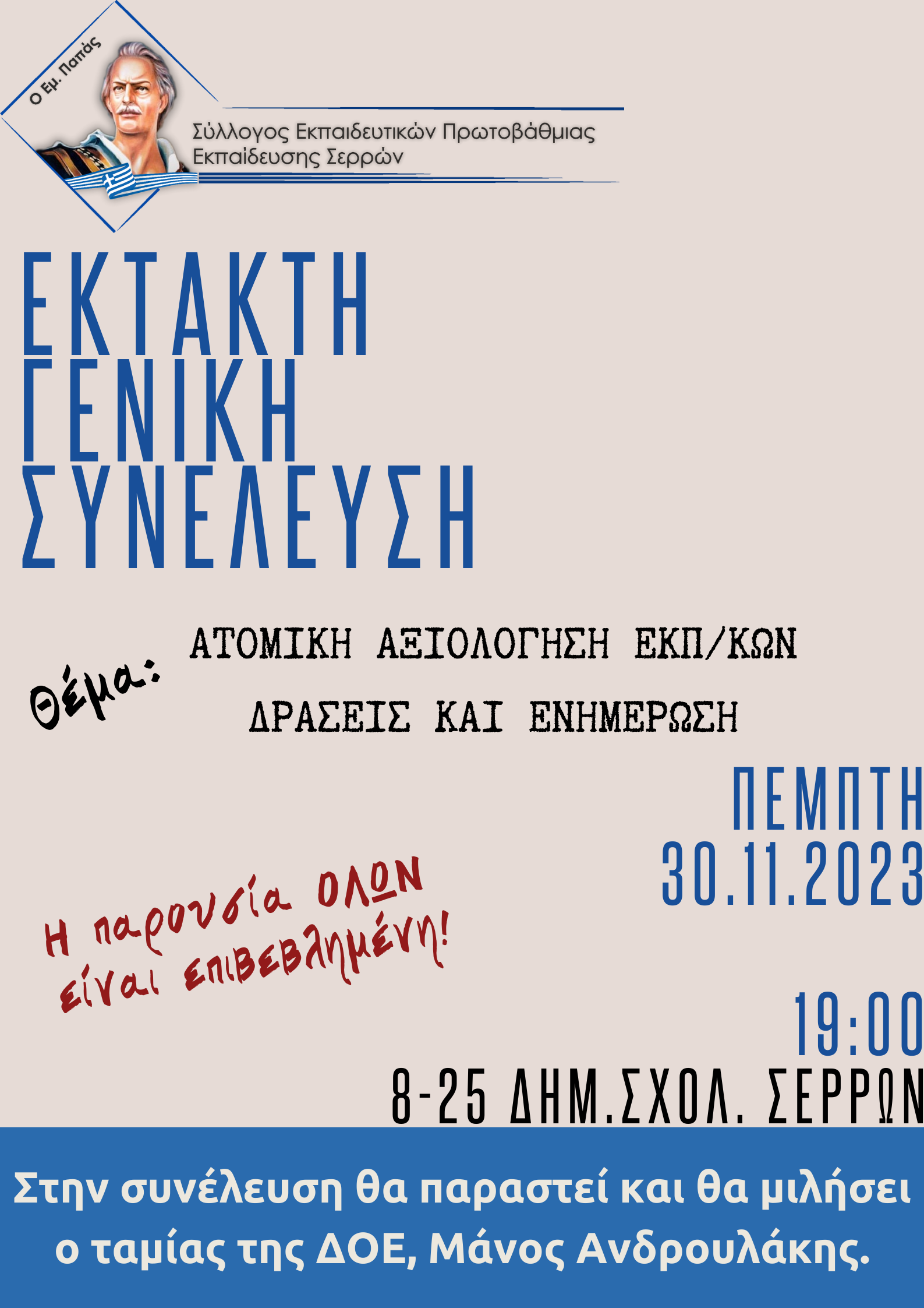 Το Δ.Σ. του Συλλόγου Εκπ/κων ΠΕ Σερρών «Ο Εμ. Παπάς» καλεί τα μέλη του σε ΕΚΤΑΚΤΗ ΓΕΝΙΚΗ ΣΥΝΕΛΕΥΣΗ με θέμα: