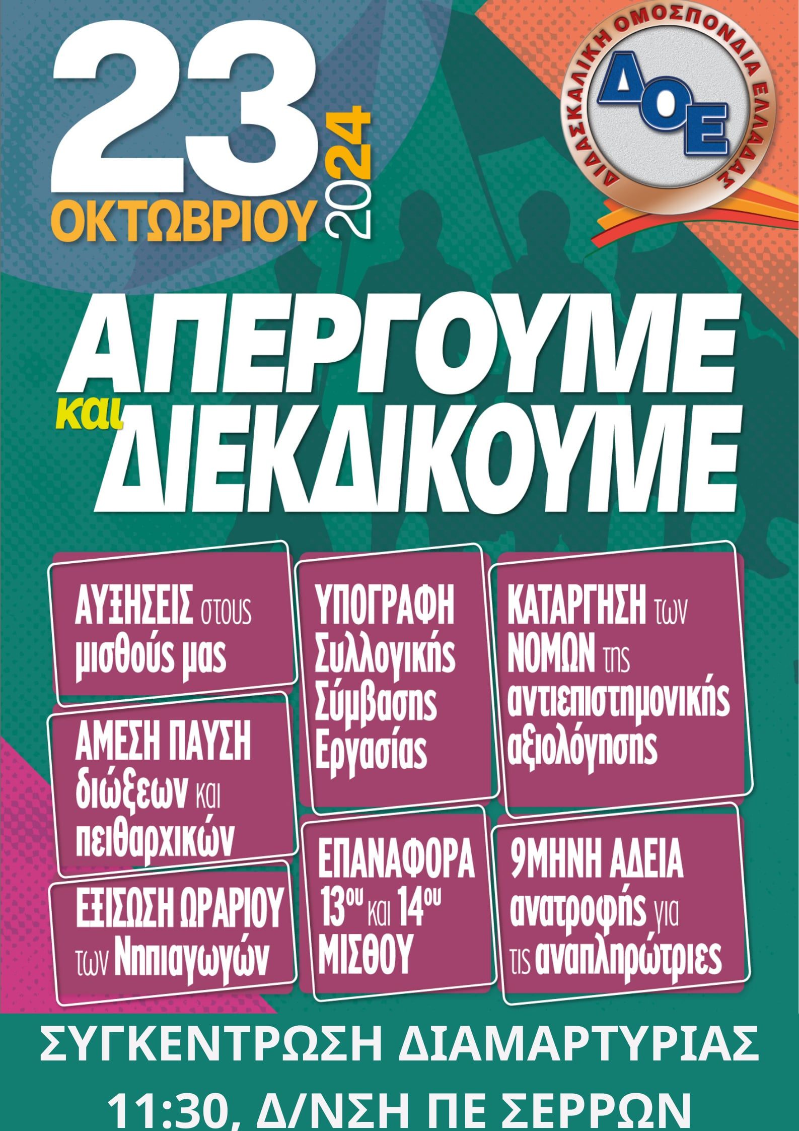 ΑΠΕΡΓΟΥΜΕ ΓΙΑ αξιοπρεπείς όρους διαβίωσης των εκπαιδευτικών ενάντια στους μισθούς εξαθλίωσης και στην ακρίβεια. Απαιτούμε να ζούμε αξιοπρεπώς από τον μισθό μας! Από τα χρόνια των μνημονίων ως σήμερα οι μισθοί μας έχουν υποστεί μείωση σχεδόν 60% στην αγοραστική τους δύναμη, ενώ η ακρίβεια καλπάζει συνεχώς και την ίδια στιγμή ο εισαγωγικός μισθός είναι 776€. Η κυβέρνηση έχει καταντήσει τον εκπαιδευτικό «παρία». Και όλα αυτά σε μια εποχή που ο Πρωθυπουργός από τη ΔΕΘ ανακοίνωσε πλεόνασμα (από τους φόρους μας) πάνω από 4,5 δις, ενώ οι μεγάλες επιχειρήσεις καταγράφουν το ένα ρεκόρ κερδών μετά το άλλο. Μας προκαλούν οργή και αγανάκτηση οι κυβερνητικές εξαγγελίες για «αυξήσεις» 12€ καθαρά από την άνοιξη του 2025. Αγωνιζόμαστε για ουσιαστικές αυξήσεις στους μισθούς μας, ώστε να ζούμε με αξιοπρέπεια. Άμεσα να επιστραφεί ο 13ος -14ος μισθός και το μισθολογικό κλιμάκιο του 2016-17. Να υπογραφεί Συλλογική Σύμβαση Εργασίας για όλο τον κλάδο, που θα κατοχυρώνει κρίσιμα εργασιακά δικαιώματα. Να εξισωθούν τα δικαιώματα μονίμων και αναπληρωτών εκπαιδευτικών. Άμεσα να κατοχυρωθεί 9μηνη άδεια ανατροφής για τις/τους αναπληρώτριες/τές. Να εξισωθεί το ωράριο των Νηπιαγωγών και των εκπαιδευτικών που υπηρετούν στα ολιγοθέσια με αυτό των υπόλοιπων εκπαιδευτικών της Πρωτοβάθμιας και συνολικά να εξισωθεί το ωράριο της Πρωτοβάθμιας με αυτό της Δευτεροβάθμιας. Να προστατευθούν οι εκπαιδευτικοί κατά την άσκηση του παιδαγωγικού τους έργου.