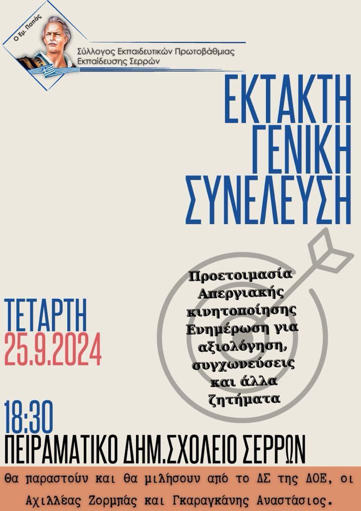 Το Διοικητικό Συμβούλιο του Συλλόγου μας, σας καλεί σε Έκτακτη Γενική Συνέλευση την Τετάρτη 25 Σεπτεμβρίου 2024 και ώρα 18:30 στο Πειραματικό Δημοτικό Σχολείο Σερρών.