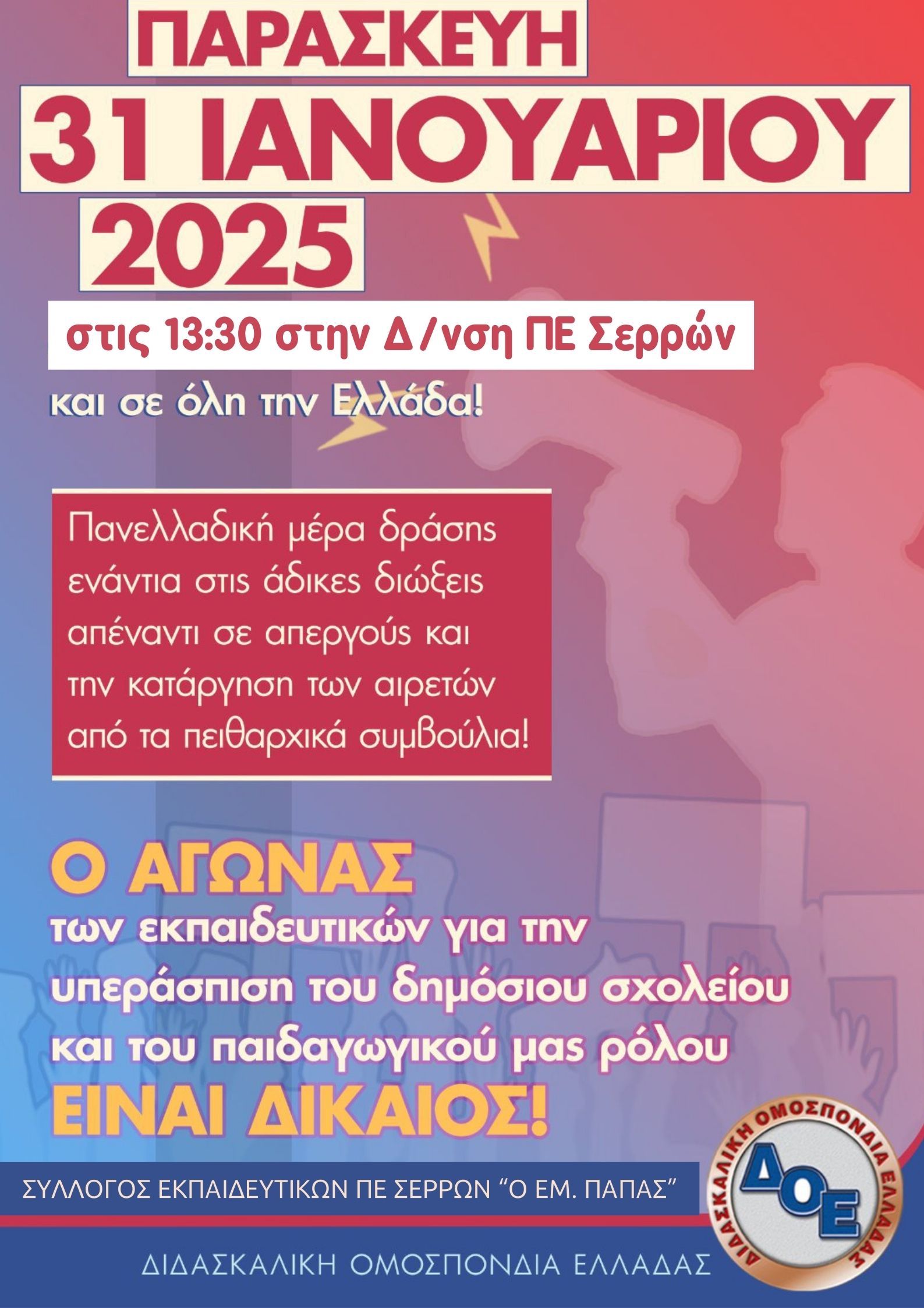 31 Ιανουαρίου 2025 – Ημέρα Πανελλαδικής Δράσης ενάντια στις άδικες πειθαρχικές διώξεις και τις καθαιρέσεις από θέσεις ευθύνης εκπαιδευτικών που υλοποιούν τις συλλογικές αποφάσεις του κλάδου καθώς και τις αντιδημοκρατικές ανατροπές που δρομολογούνται στα πειθαρχικά συμβούλια με την αποπομπή των αιρετών