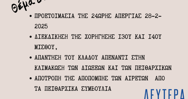 - την προετοιμασία της 24ωρης απεργίας στις 28 Φεβρουαρίου που συμπληρώνονται 2 χρόνια από το έγκλημα στα Τέμπη,