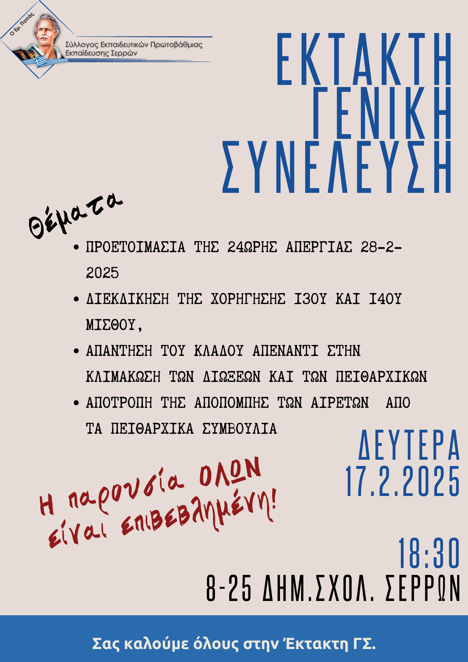 Το Διοικητικό Συμβούλιο του Συλλόγου μας, σας καλεί σε Έκτακτη Γενική Συνέλευση τη Δευτέρα 17 Φεβρουαρίου 2025 και ώρα 18:30 στο 8-25ο Δημοτικό Σχολείο Σερρών με βασικά θέματα
