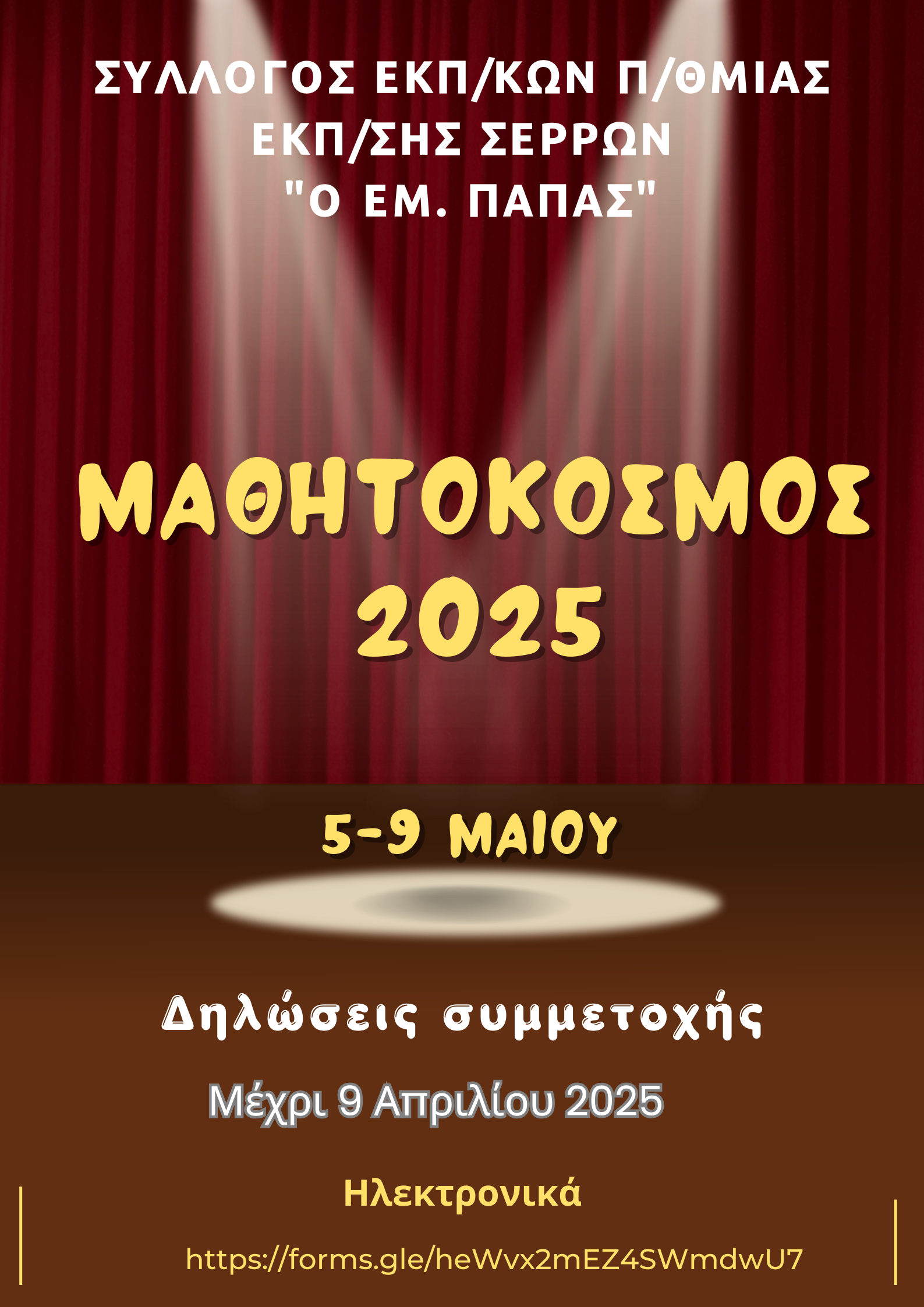 Περιεχόμενο των εκδηλώσεων όπως πάντα: θέατρο, μουσική, (οργανική-φωνητική), ελληνικοί χοροί, νέες τεχνολογίες, ταινίες, καλλιτεχνικά έργα των μαθητών (θα εκτεθούν στο φουαγιέ των Αστεριών ως εικαστική έκθεση) και ό,τι άλλο νομίζετε ότι μπορεί να συμπεριληφθεί σ’ αυτές. Όσοι συνάδελφοι ξεκίνησαν τέτοια πολιτιστικά προγράμματα στα σχολεία τους ή πρόκειται να πραγματοποιήσουν, και επιθυμούν τη συμμετοχή τους στις εκδηλώσεις «ΜΑΘΗΤΟΚΟΣΜΟΣ 2025», παρακαλούνται να το δηλώσουν μέχρι την Τετάρτη 9-4-2025, στην ηλεκτρονική φόρμα: